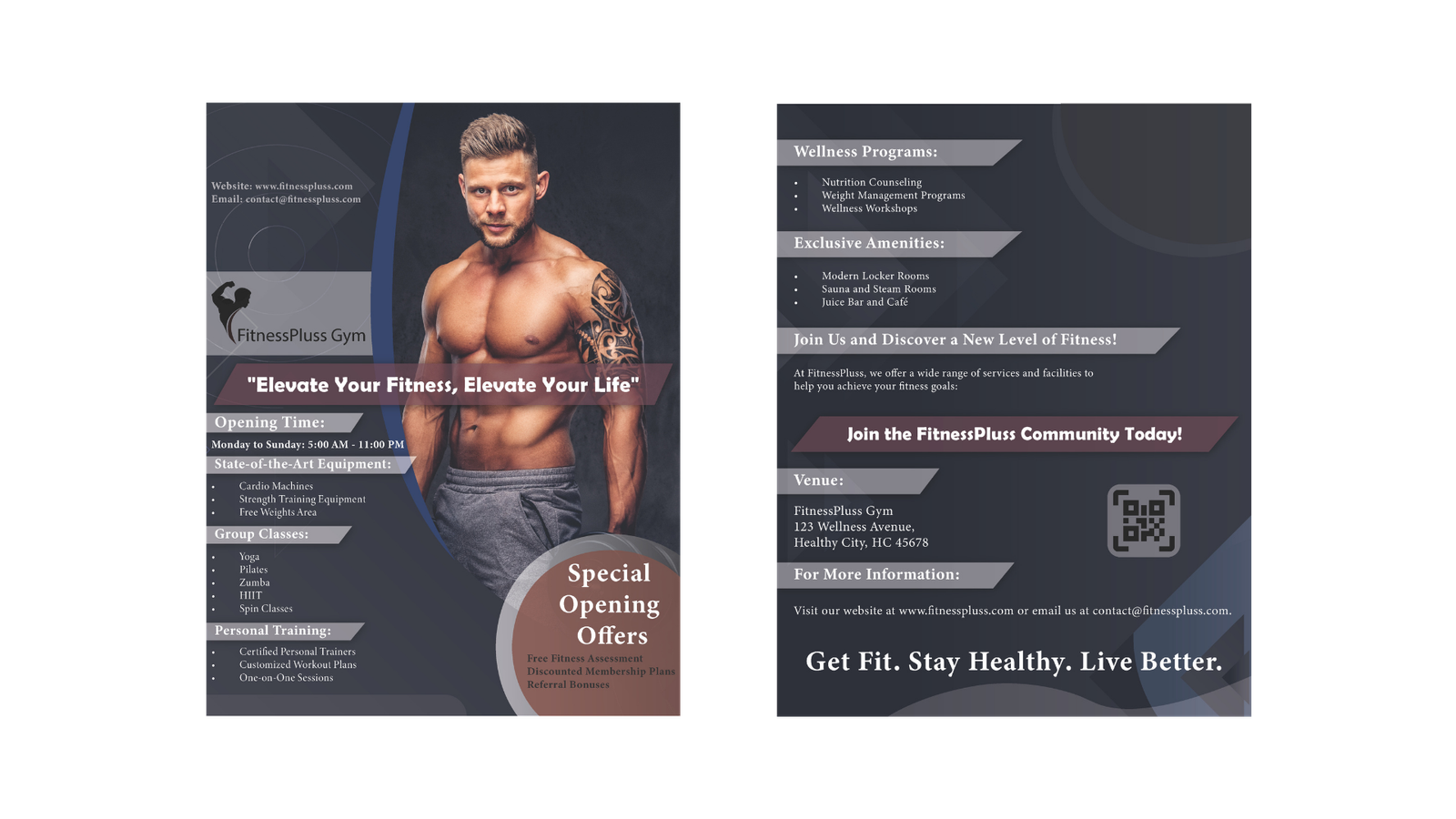 I was approached by FitnessPluss Gym to design an engaging, double-sided print flyer for their new facility opening. The goal was to create a bold, modern, and energetic design that would effectively communicate their premium amenities to potential members. I focused on using high-contrast colors, powerful imagery, and a clean hierarchical layout to present information logically, from class schedules to special opening offers. The final design successfully balances brand aesthetics with a clear call to action, providing the gym with a compelling marketing tool to launch their brand offline.